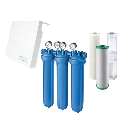 The 10 micron pleated cartridge filter traps fine sediment. Removing sediment reduces wear and tear on tapware and valves, including those in household appliances.